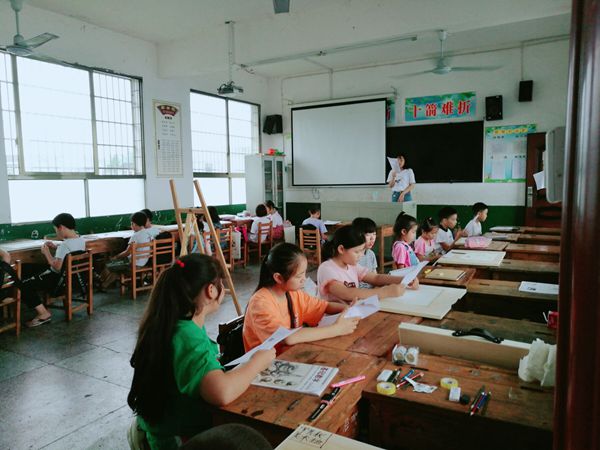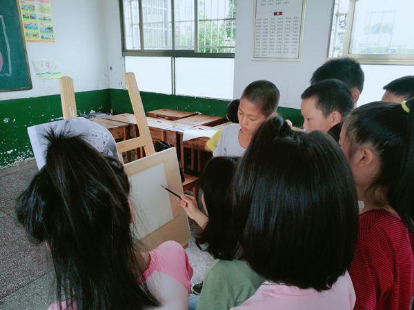 同時支教組在課堂上運用各種形式讓學生在快樂中學到繪畫知識,在場聽課的小朋友眼睛緊緊的看著黑板,不時地還在本子上做筆記,一些好奇的學生提出的各種有趣的問題,志愿者們都耐心而細致地回答。課余時間,志愿者們帶著小朋友開展各種有趣的活動,在鄉(xiāng)村田野中放飛心情,有說有笑,和學生之間的距離迅速拉近。