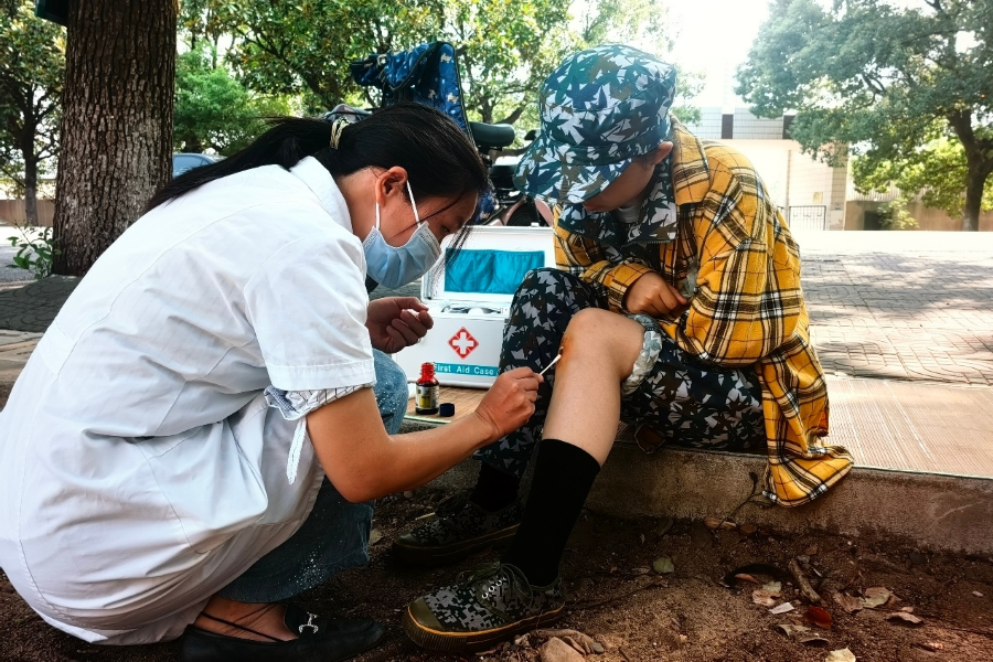 為更好地保障軍訓期間防疫與醫(yī)療服務工作,學院專門設立醫(yī)療站提供醫(yī)療物品與能量補給品,將學院對學生的醫(yī)療健康關懷落到實處。感冒、受傷、昏迷、身體不適都是軍訓中常發(fā)生的情況,而醫(yī)療隊成員們充分運用應急救護知識應對訓練場上的突發(fā)事件,第一時間為新生們進行救助服務。
