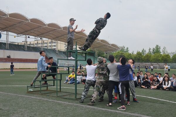 活動(dòng)開展分為四個(gè)小組,由四名教官分別帶隊(duì)。四個(gè)小組的成員首先做了自我介紹,然后由教官帶領(lǐng)做一元五角、坐地起身、信任背摔、畢業(yè)墻、穿越電網(wǎng)和團(tuán)隊(duì)有我更精彩六個(gè)項(xiàng)目。其中最精彩的部分要屬信任背摔了,保護(hù)學(xué)員站成兩排,前排學(xué)員伸直胳膊,掌心朝外,雙手交叉,十指交叉握緊從胸前翻出,雙手緊貼胸口。后排學(xué)員距前排學(xué)員一步,成弓步站立,兩手向前平伸,手心向前,指尖向外,胳膊肘彎曲,準(zhǔn)備做保護(hù)動(dòng)作。臺(tái)上的同學(xué)垂直倒下來(lái)由下面的學(xué)員接住。這個(gè)活動(dòng)既緊張刺激,帶動(dòng)了現(xiàn)場(chǎng)氣氛,又培養(yǎng)了學(xué)員之間團(tuán)結(jié)協(xié)作的能力,增進(jìn)了學(xué)員之間的互信,可謂一舉多得。