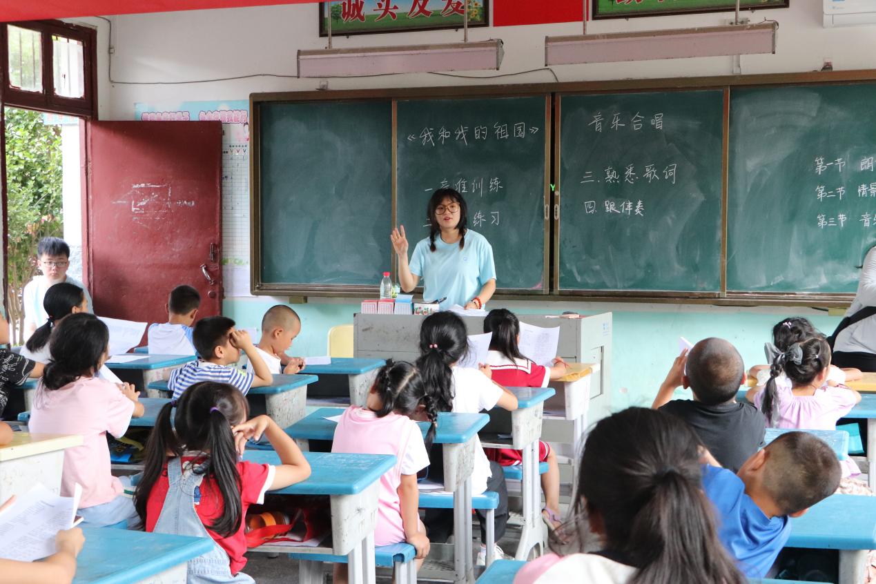 最后,到聲樂部分時,志愿者肖琴,熱情大方地為學(xué)生講解簡單的音樂常識并激情彭湃地進(jìn)行示范,在帶小朋友們開嗓、練習(xí)五音和節(jié)拍后,就正式進(jìn)入《我和我的祖國》的學(xué)習(xí),“我和我的祖國一刻也不能分割,無論我走到哪里,都流出一首贊歌......”嘹亮的歌聲在教室里回響起來。