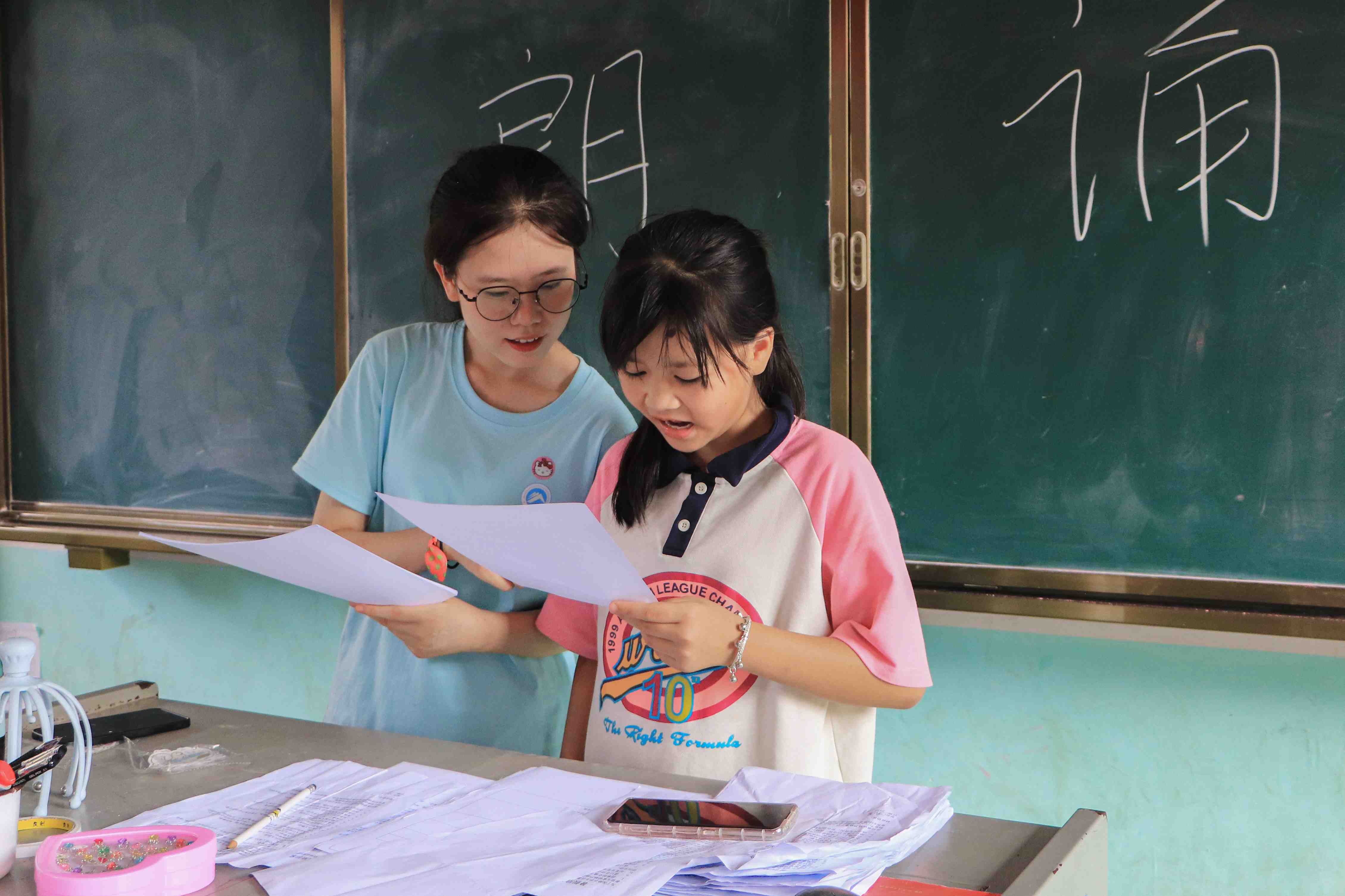 課程期間,除了臺上的主講志愿者外,臺下,實踐團(tuán)隊其它成員也耐心細(xì)致地對學(xué)習(xí)過程中有問題的學(xué)生進(jìn)行單獨指導(dǎo),提醒他們集中注意力、幫助他們一一糾正坐姿、發(fā)音,并告訴他們學(xué)習(xí)方法。學(xué)生們認(rèn)真聽取建議,調(diào)整狀態(tài),即使是一些比較調(diào)皮的學(xué)生也在志愿者們一遍一遍的指導(dǎo)中,進(jìn)入了學(xué)習(xí)狀態(tài)。